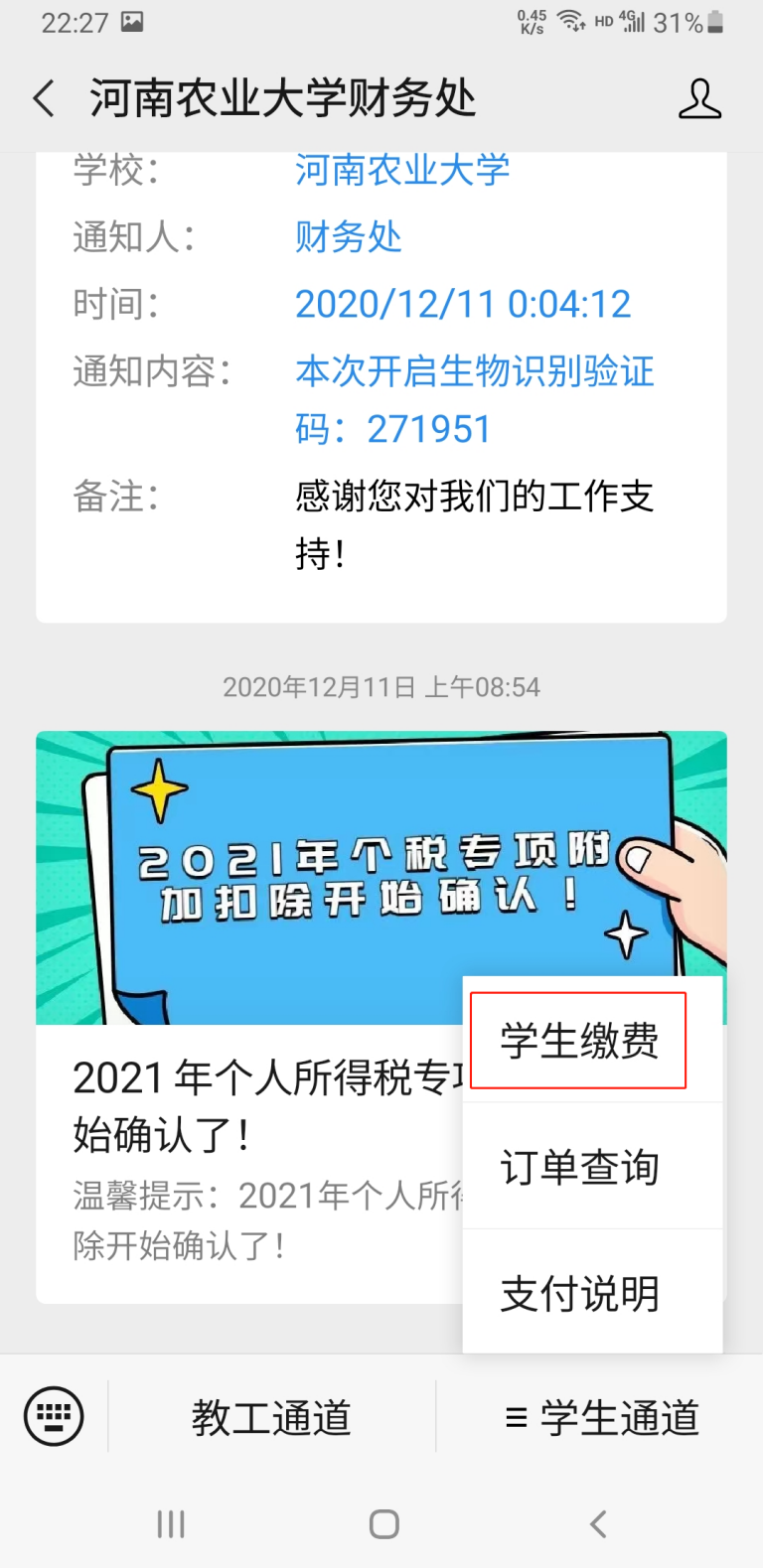 2. 进入公众号,点击右下角“学生通道”-“学生缴费”。