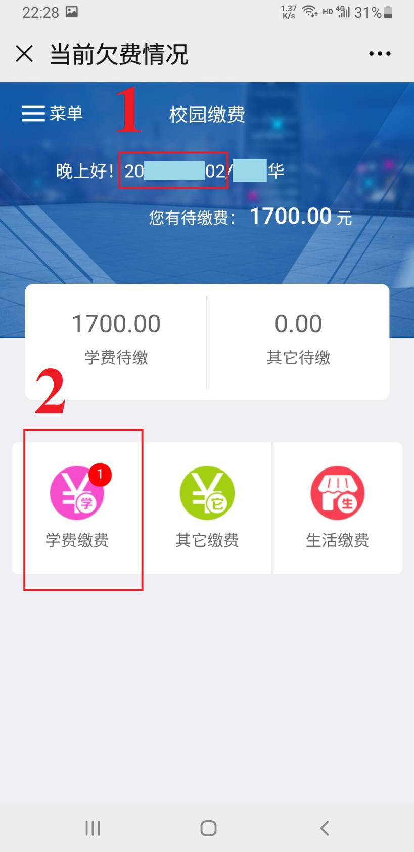 红框1处为本次缴费涉及学生的“财务学号”,可能与学生实际学号不同,仅用于缴纳学费。点击红框2处“学费缴费”,按提示操作。待缴学费数额以公众号显示为准。